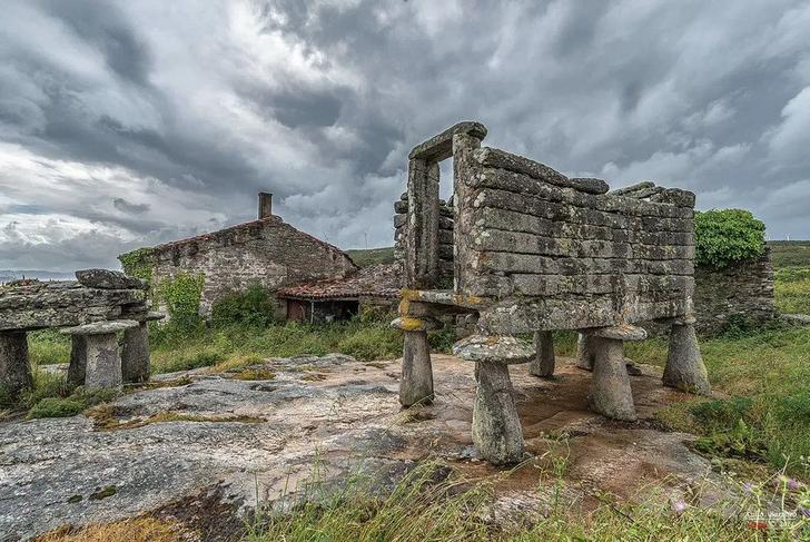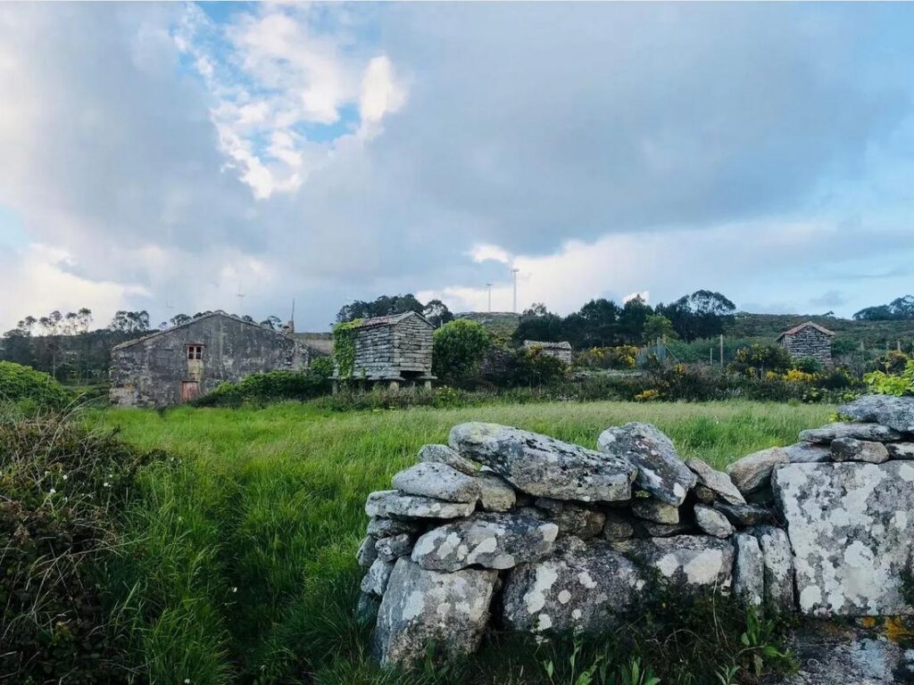 The village includes around 10 traditional stone houses, several hórreos (Galicia’s iconic stone granaries), overgrown lanes and terraces shaped by decades of abandonment, and panoramic views over hills and out to the Atlantic.