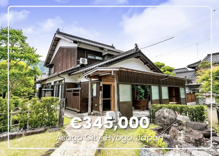 This elegant two-story house sits in Asago, Hyōgo Prefecture, western Japan, where forested mountains rise above rural valleys. The region is known for Takeda Castle, a 15th-century mountaintop fortress called the “castle in the sky” that appears to float above morning mist. The ruins stand ten miles away, with hiking trails winding through the surrounding mountains.