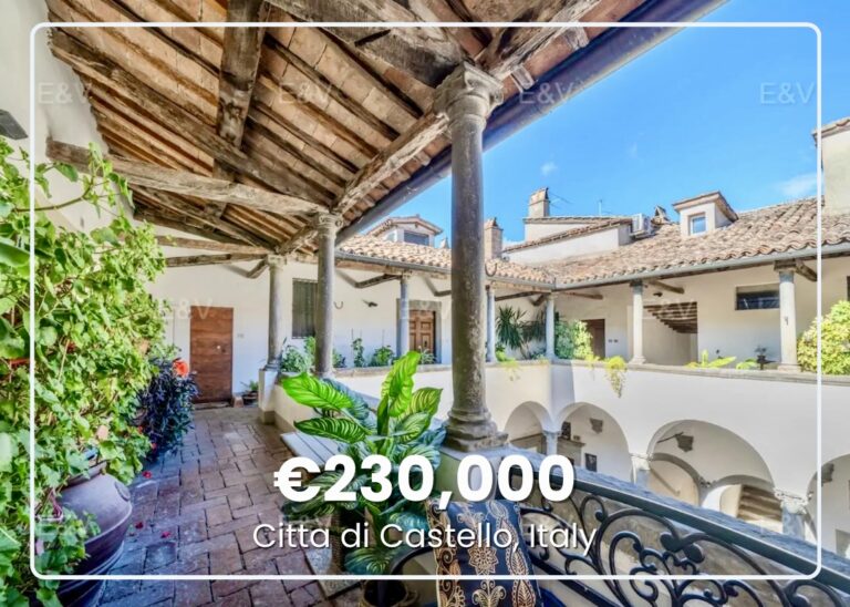 This refined apartment occupies Palazzo Vitelli Rondinelle in the heart of the historic center. The 1,240-square-foot residence holds two bedrooms and two bathrooms across two levels within a converted loft space. Exposed beams and authentic Florentine terracotta floors warm the interiors throughout. Access to the apartment is through a three-level cloister featuring columns with Corinthian capitals and a sandstone staircase.