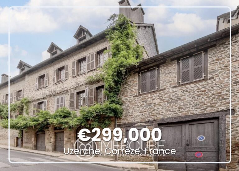 This stone townhouse of around 3,550 square feet stands on the heights of Uzerche, with a fully enclosed garden of around half an acre, a patio, and a collection of outbuildings. The ground floor holds an entrance hall, a living room, a dining room, and a kitchen. The first floor contains four bedrooms, a study, a bathroom, and two shower rooms. Above that, an attic room and a loft with bathroom provide additional space. The substantial basement contains a boiler room, two garages, a workshop, and a vaulted cellar that runs the full footprint of the house.