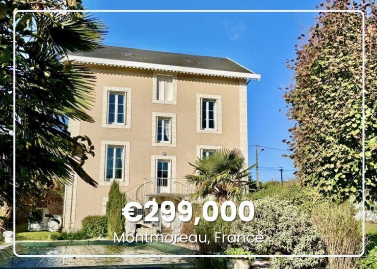 The market town of Montmoreau sits in the Charente countryside of southwestern France, where rolling hills covered in vineyards and sunflower fields stretch toward wooded valleys. The town offers sports facilities including tennis and paddle courts, along with restaurants, shops, and medical services within walking distance. Bordeaux–Mérignac Airport stands 65 miles west.