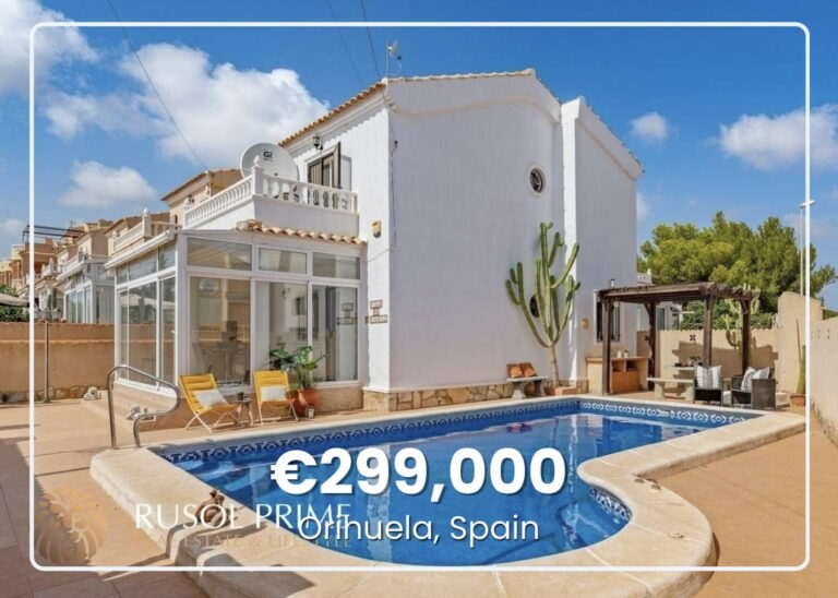 This charming three-bedroom house stands in the residential district of Lomas de Cabo Roig, half a mile inland, where palm-lined avenues wind through low-density neighborhoods. The property sits on a 2,640-square-foot lot with a private swimming pool. Bars, restaurants, and shops sit within walking distance, while La Zenia Boulevard, one of the Mediterranean’s largest outdoor shopping centers, offers dozens of international restaurants and shops within a short drive.