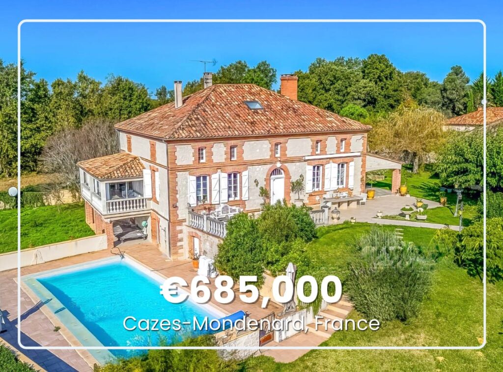 This stately five-bedroom manor house stands on 35 acres of gardens, pasture, and woodland near Cazes-Mondenard in southwestern France. The