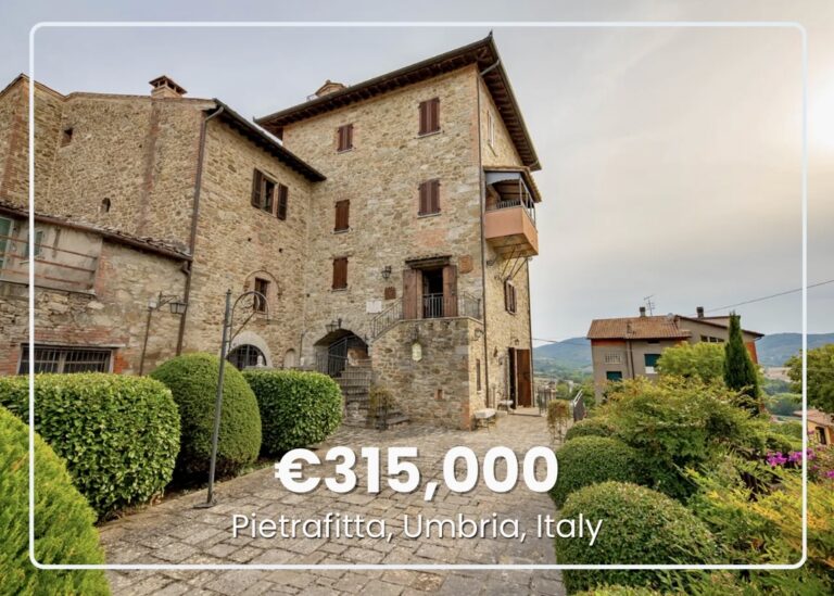 This elegant stone house sits within the historic Pietrafitta Castle walls in Pievina, Tuscany, central Italy, where medieval hill towns rise above rolling vineyards and olive groves. Stone towers and medieval castles dot the hillsides, with wooded valleys extending toward the Umbrian border. The mild climate brings warm summers and gentle winters, ideal for spending time outdoors exploring the region’s Renaissance towns, countryside trails, and wine estates.
