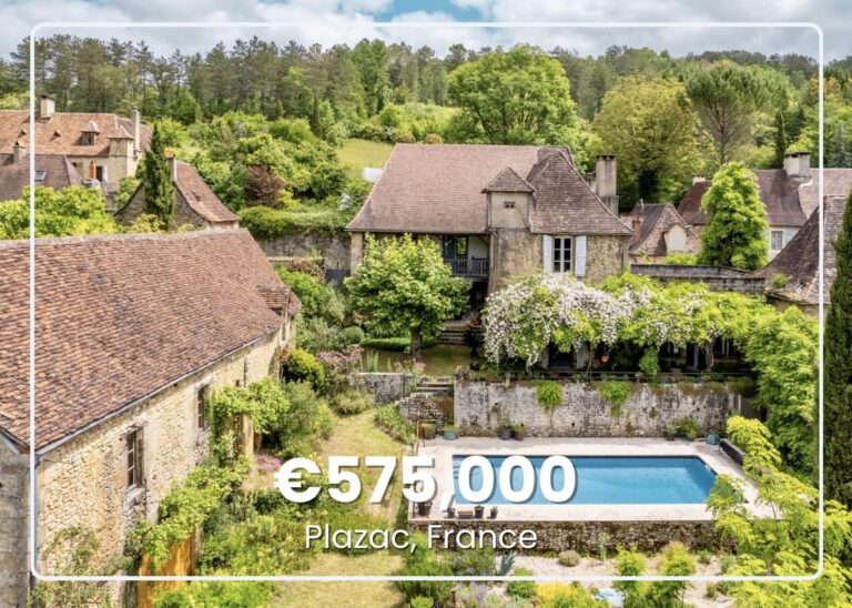 This impressive four-bedroom stone house of 3,600 square feet occupies a prime position in the village center of Plazac in southwestern France. A covered private passage from the village lane leads directly to the house, where a spacious entrance hall opens onto a living room with fireplace and a large kitchen-dining room.