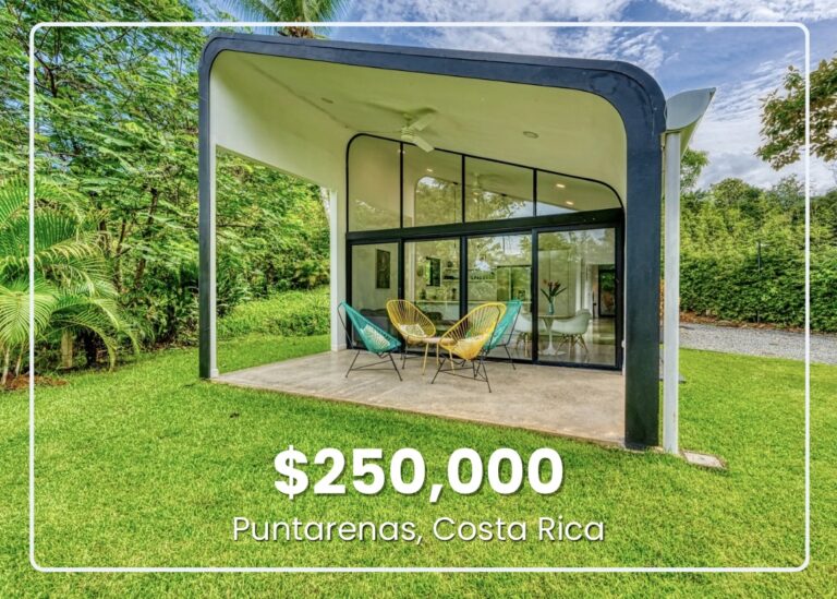 This sleek two-bedroom villa stands in the jungle hills above Uvita, a surf town in Puntarenas on Costa Rica’s southern Pacific coast where whale-watching season draws humpbacks to warm waters and coastal trails wind through national park rainforest. The property spans approximately 860 square feet on a 5,660-square-foot lot planted with fruit trees and tropical vegetation, with space for a future pool or yoga platform.