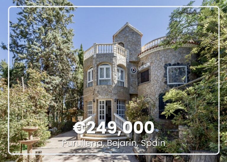 This castle-style stone house of around 2,700 square feet sits on a quiet hillside near Purullena, in the province of Granada, with mountain views and a garden of around 6,500 square feet. Built in 2002, it has six bedrooms, two bathrooms, a living room with high ceilings and a bar area, and a fully equipped kitchen. A separate outbuilding in the garden has its own fireplace and could serve as a study, games room, or guest space. Outside, a balcony, terrace, pergola, patio, and barbecue area. The house comes fully furnished with antique furniture.
