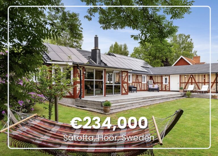 This charming single-story brick villa stands on a corner garden plot in southern Sweden, where open pastures roll toward walking trails and quiet countryside. Built on over a third of an acre of freehold land, the home spans approximately 1,290 square feet with an additional 270 square feet of utility space. Mature gardens wrap around a large wooden deck, while the corner location borders directly onto grazing land and nature areas.