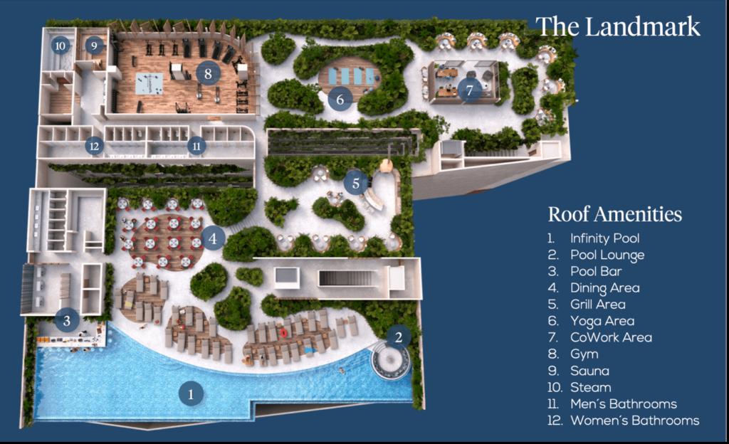 - This community will be next-level, with a half acre rooftop amenity area called The Sky Club. This will be unique in Playa del Carmen. A half-acre of lushly landscaped luxury, with a sauna, infinity pool, gym, restaurant and Caribbean views. Resort-level amenities like this in Playa are a major premium, but nowhere has a rooftop amenities area as expansive and devoted to quiet luxury as Landmark.