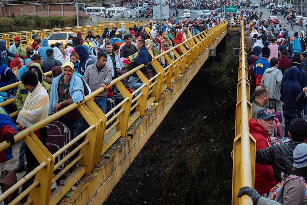 Venezuelan migrants wait to cross a bridge into Ecuador. Millions of people have fled Venezuela as the economy unraveled.